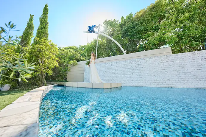太陽の光が水面に美しく輝くプライベートプール、鐘の音が美しく奏でるカリヨン、所々に配されたガーデンチェアなど、邸宅内にはフォトジェニックなポイントが多数。おふたりやゲストとの撮影を自由にお楽しみいただけます。