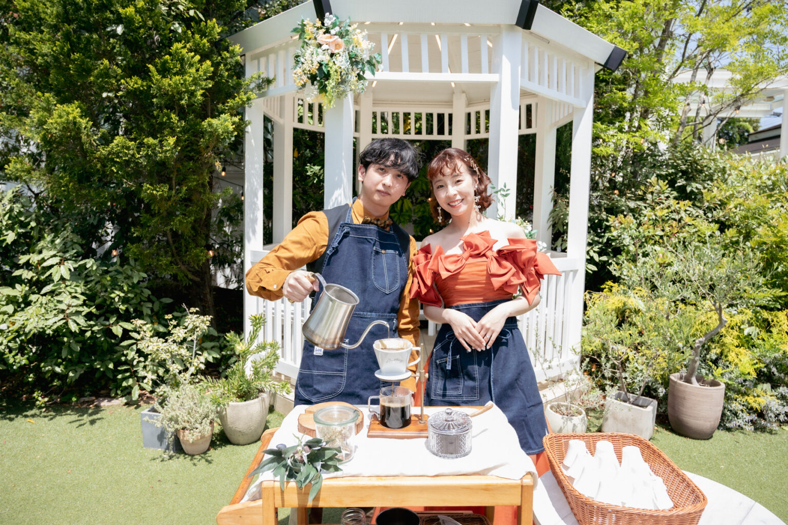 そして、結婚式当日はそんなおふたりの雰囲気が、ゲストにも伝わる温かいシーンで溢れていましたね。ガーデンで行ったケーキイベントやコーヒードリップもおふたりらしくてとても素敵でした!ご家族の皆様にも、きっとおふたりのおもてなしや優しさが届いていることかと思います。