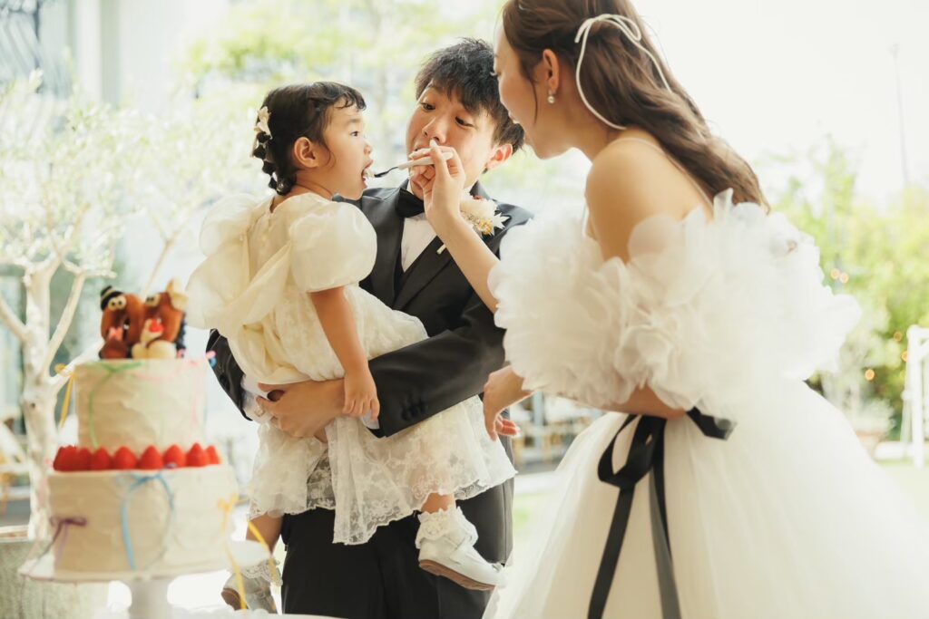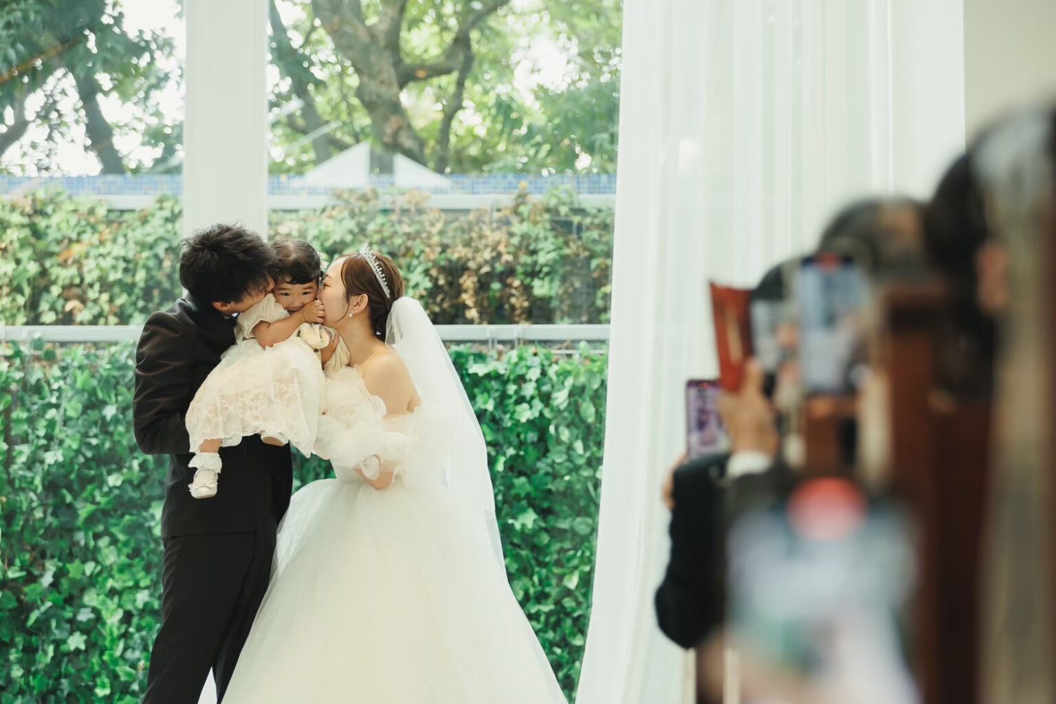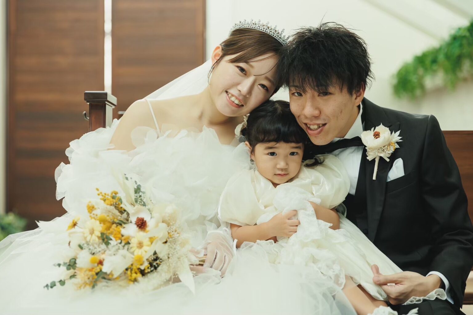 挙式は、地元のご友人やご家族の皆さまに見守られながら和やかに進みます。おふたりが楽しみにしていた、ののちゃんの『リングガール』堂々とパパとママの元へ指輪を届けてくれました!そして誓いのキスは、だいすきなののちゃんへ送りました。