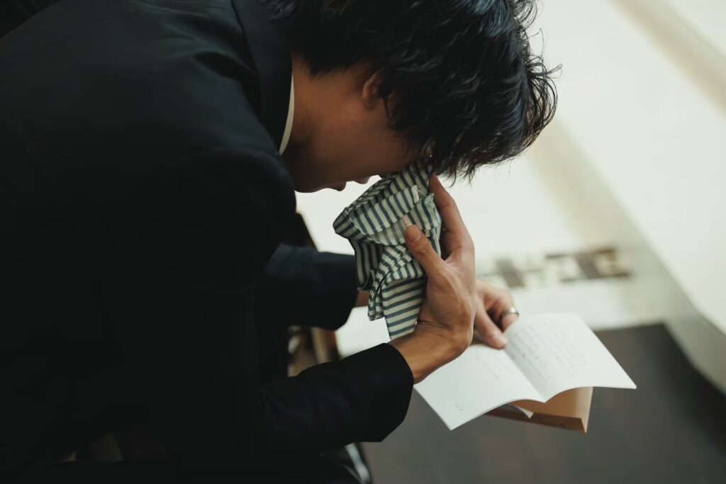 みなさんがゆうきさんの肩をトントンとすると、振り返りながら思わず涙が溢れます。それを見て、笑みが溢れるみなさん。そんなみなさんへ、今度はゆうきさんから…「ありがとう」「だいすきだよ」「これからもずっとよろしくね」と、想いのこもったお手紙と花束のプレゼントが。
