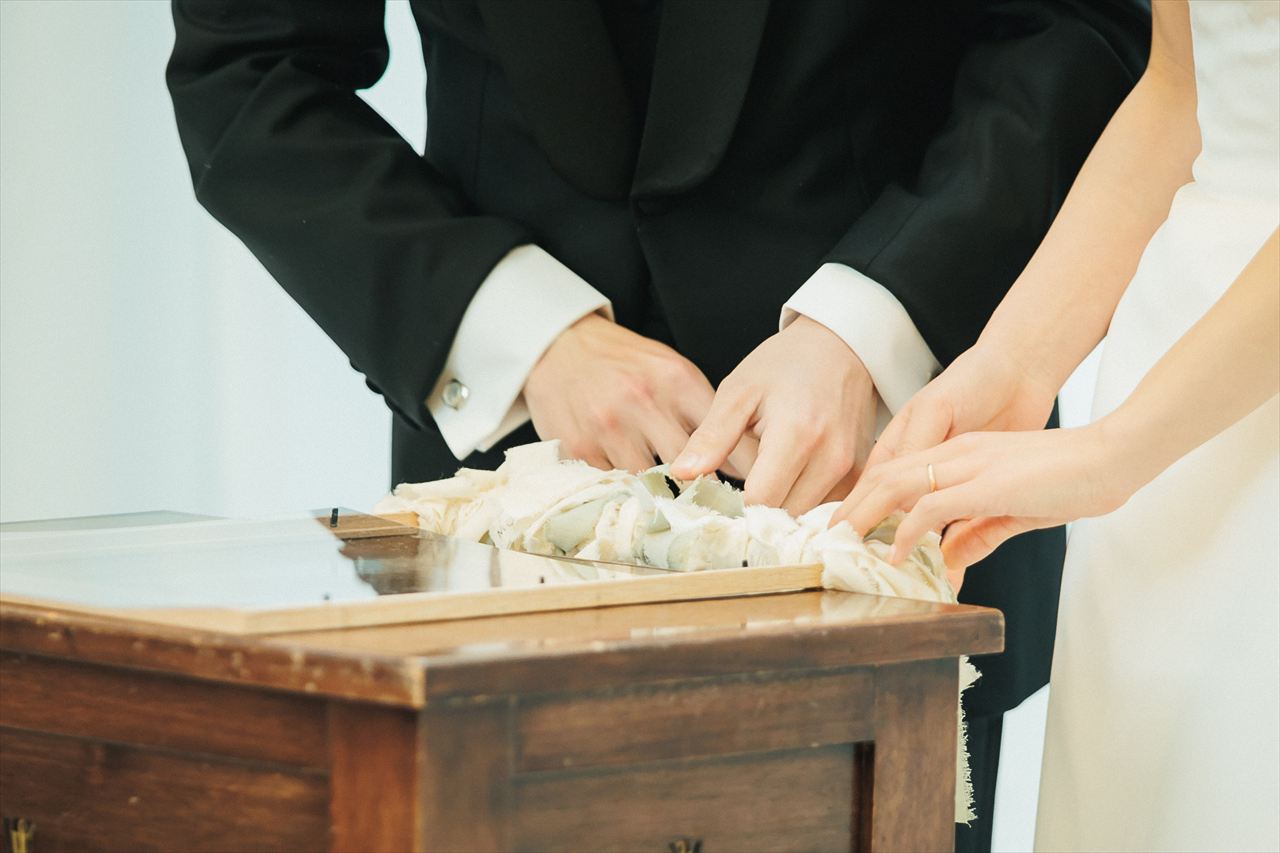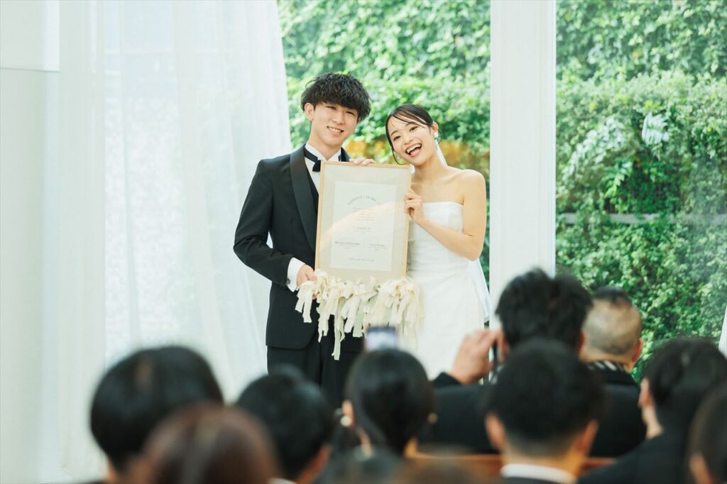 おふたりの結婚証明書は、結婚式のテーマである『結び』にちなんで、ゲストにリボンを結んでもらいました。最後におふたりもリボンを結び完成です。ゲストの皆さまとの結びつきを感じられる、とても素敵な結婚証明書となりました。