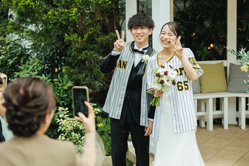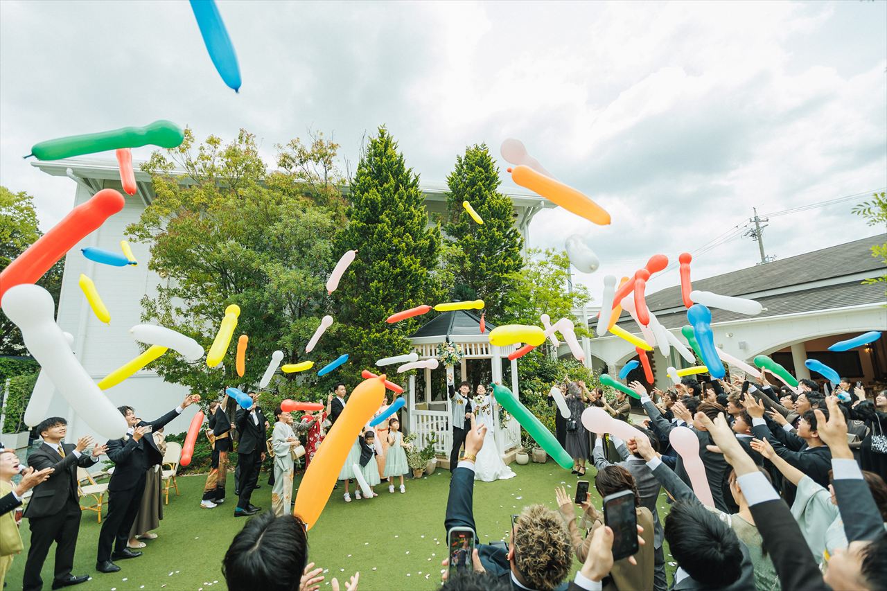 そしておふたりが楽しみにされていた『ジェット風船リリース』を全員で行いました。野球観戦がお好きなおふたり。野球場のようにおふたりの応援しているチームの曲をかけ、タイミングに合わせて空へと放ちます!軽快な音を立てながら風船が綺麗に舞い、全員で楽しめるイベントとなりました♪